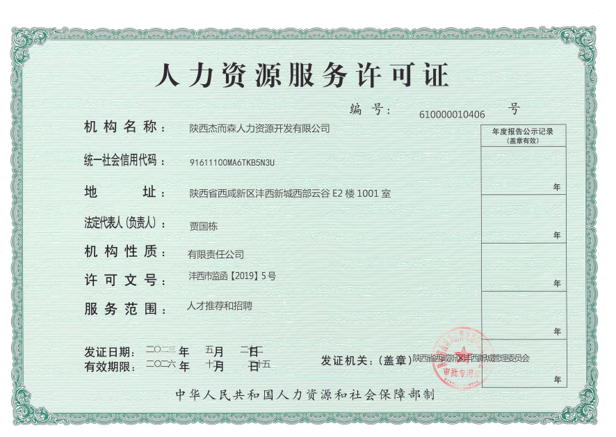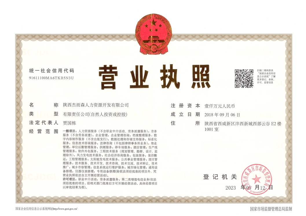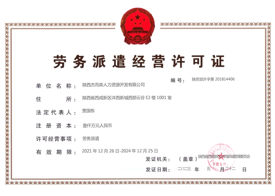 陜西杰而森人力資源開發(fā)有限公司成立于2018年,是一家以人力資源服務(wù)為主業(yè)的市場化專業(yè)機(jī)構(gòu)。公司總部位于陜西省西咸新區(qū)秦創(chuàng)原人才大市場,下設(shè)6家分子公司。公司的主營業(yè)務(wù)包括:勞務(wù)派遣、勞務(wù)外包、業(yè)務(wù)流程外包、招聘、培訓(xùn)、檔案整理和電子化等服務(wù)。